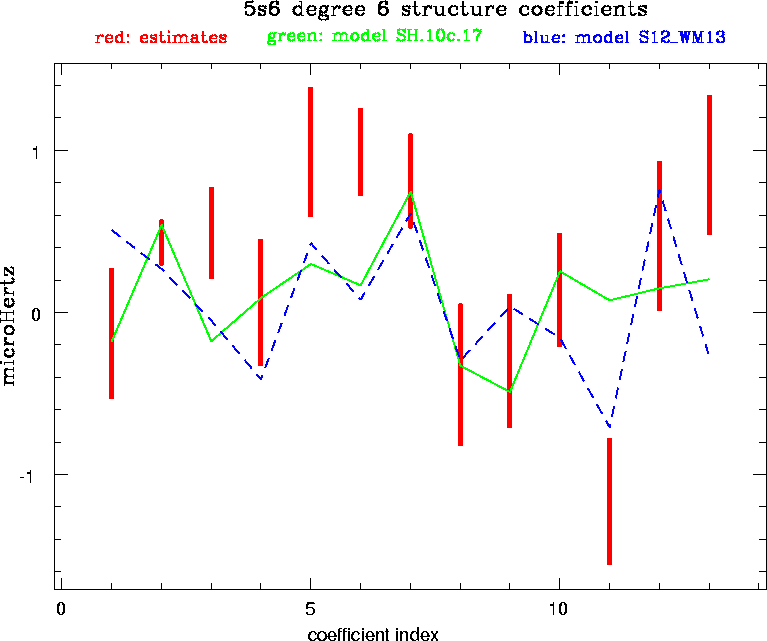Note: Coefficients are arrayed from left to right (1,2,3,4,5,6,7,8,9,10,11,12,13) as c60, Re c61, Im c61, Re c62, Im c62,....., Re c66, Im c66. Coefficients defined relative to fully normalized complex spherical harmonics. Units are in micro-hertz. To compare these coefficients with those from other studies which present unitless coefficients, divide the coefficients by the degenerate frequency of the multiplet and utilize the appropriate conversion to the real spherical harmonic formulation.